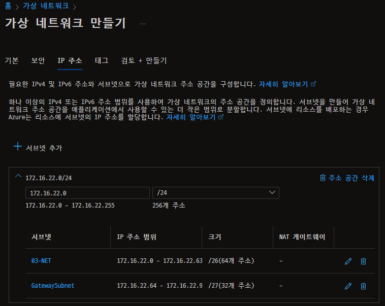 - 가상 네트워크 생성 시 주소 공간을 생성하고 서브넷을 추가한다.
