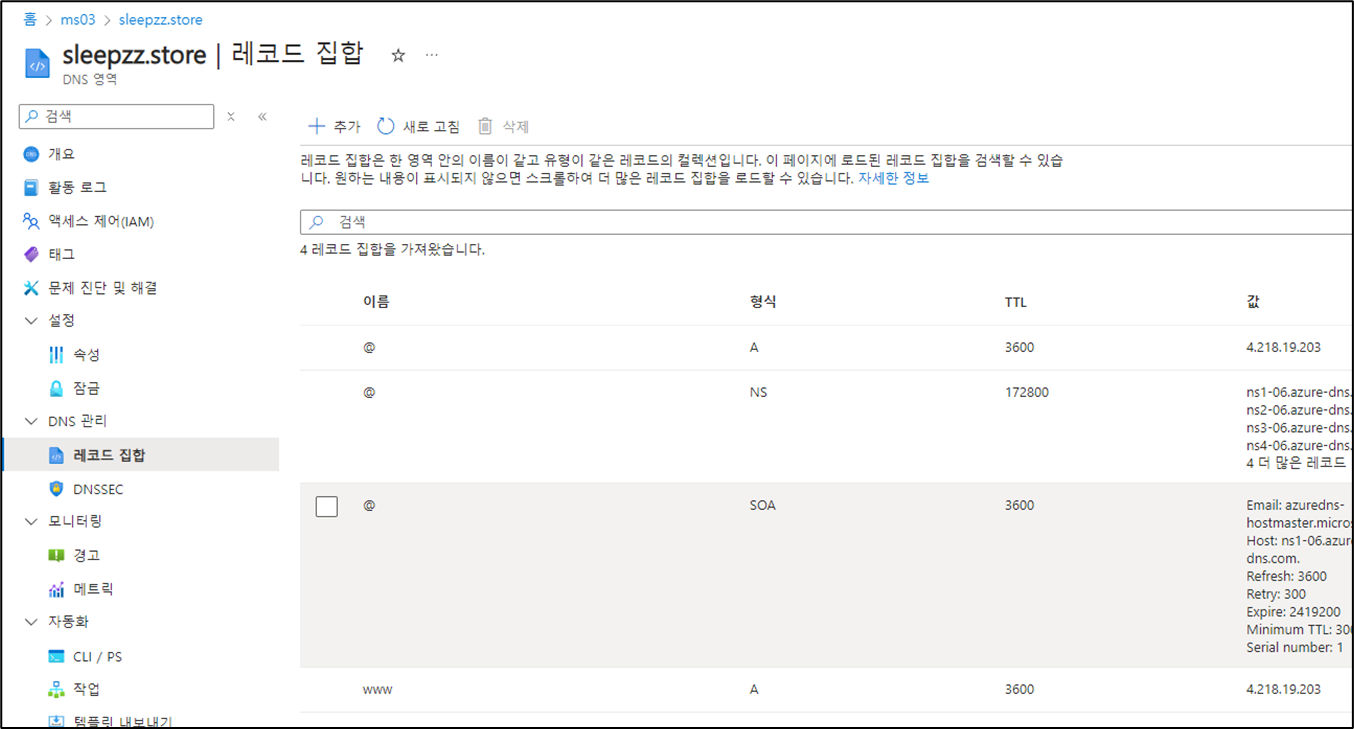 - 호스팅 업체에서 등록한 IP 주소(4.218.19.203) 레코드 설정