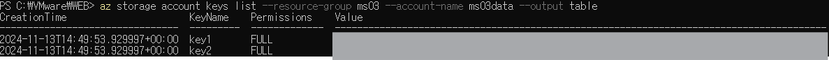 az storage account keys list --resource-group ms03 --account-name ms03data --output table