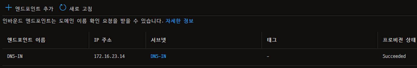 - 인바운드 엔드포인트에서 IP를 설정하여 DNS Private Resolver를 바라보고 올 수 있게 설정한다.