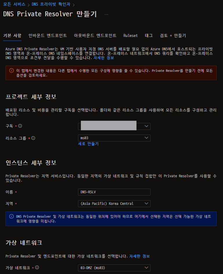 - 온프레미스 환경에서 프라이빗 DNS 영역에 등록된 레코드 값을 사용하기 위해 IP를 할당하기 위해 DNS Private Resolver를 생성한다.
